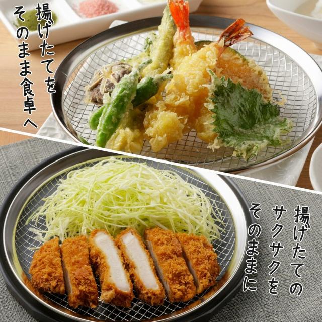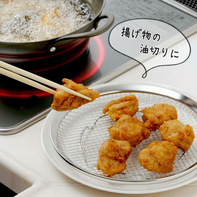 水・油切れが早い!アミ目を大きくすることで、サッと水・油が切れます。から揚げなども直接油切りに、そのままお皿にのせてテーブル上に。底が浮くことで余熱でベチャっとなりにくい!天ぷら等の受け皿に。溶接アミを使用し、スポンジが引っ掛かりにくく油汚れもスッキリ落ちます。野菜の水切りザルにも!