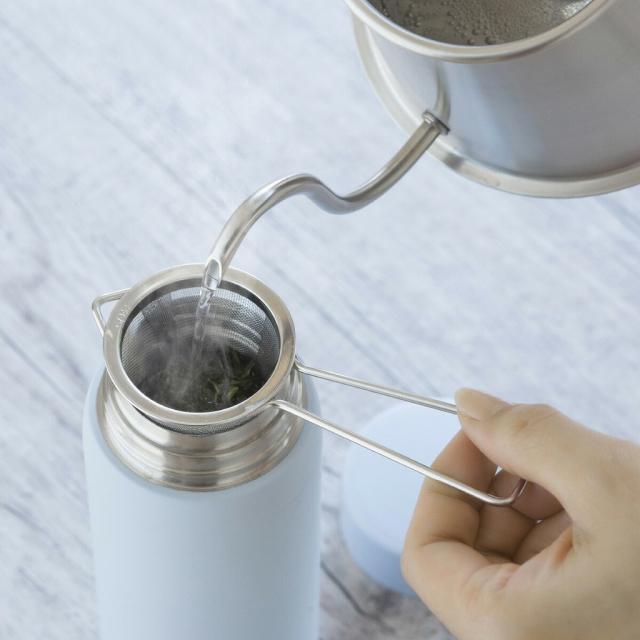 マグ(携帯)ボトルにそのままダイレクトに茶こし。スリムで深型形状、口の細いボトルでもお好みの濃さになるまで茶葉を浸しておけます。