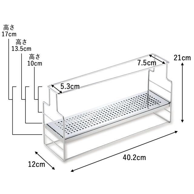 幅40.2×奥行12×高さ21cm 上部内寸:幅39×奥行(左)5.3・(右)7.5cm 高さ内寸:上段10・中段13.5・下段17cm(上ワイヤーから棚まで) 棚:幅38.4×奥行10.4cm 重量(約)/850g
