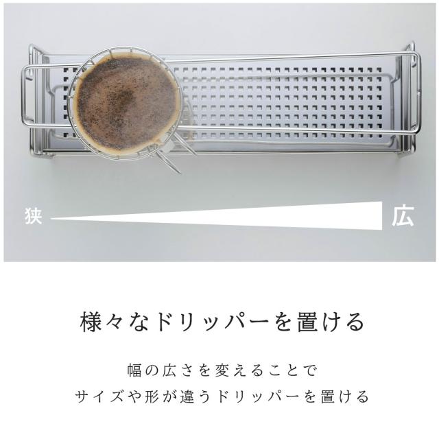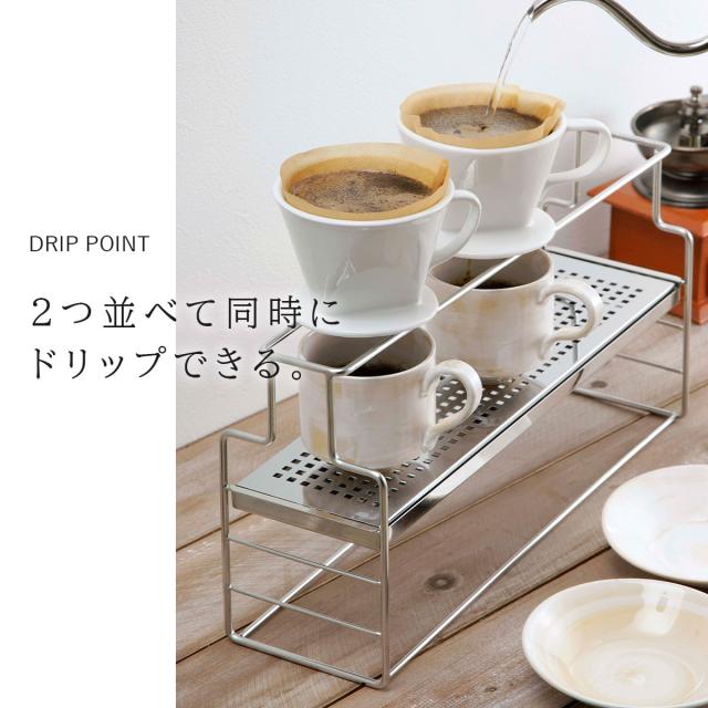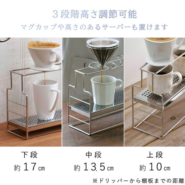 コーヒー専門店のようにハンドドリップをご家庭で!3杯同時にドリップ可能。ドリップ量が見えるので淹れ過ぎてあふれてしまうことがありません。コランダー棚でポタポタ滴をキャッチ。棚の高さが3段に調整でき低いカップからマグカップ、大きなサーバーまで周囲に飛び散らずにハンドドリップできます。