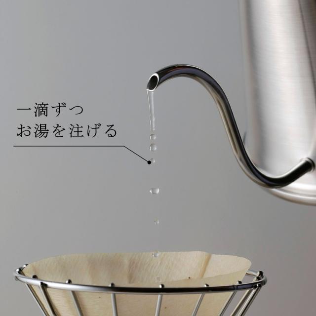 雫のようにポタリポタリ、糸のようにツーと微妙なお湯の量が調整できます。超極細6mm径の注ぎ口は、お湯の注ぎ過ぎを防ぎ、こだわり味をブレさせない思い通りのハンドドリップができます。約15cmと長い注ぎ口がドリップに適した温度にお湯を冷まします。 金属加工技術でも知られる新潟県燕市から、丁寧に作った至極のドリップポットで美味しいコーヒーを! IH電磁調理器対応。