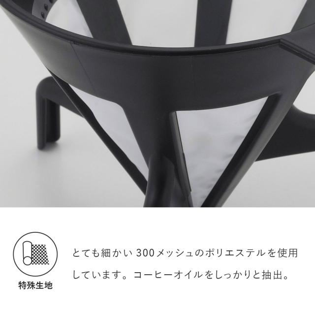 ペーパーフィルター不要!お好みのカップの上にフィルター本体をのせるだけで準備OKです。ペーパーフィルターがいらないので余分なごみも出ずエコで節約にもなります。携帯(マグ)ボトルにもセットしてドリップできる形状です。もちろん、コーヒーサーバーにも使用可能。約1〜4人前のドリップコーヒーが作れます。 ※コーヒー豆は中挽きをご使用ください。