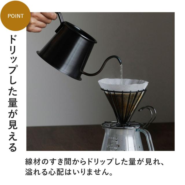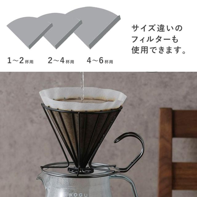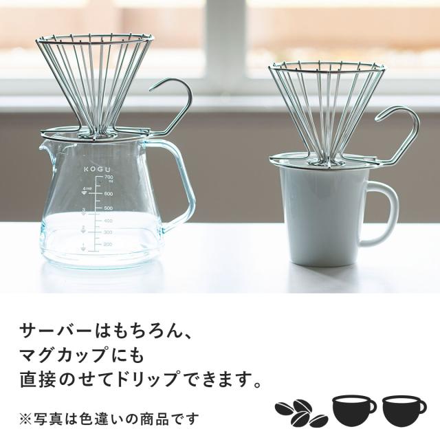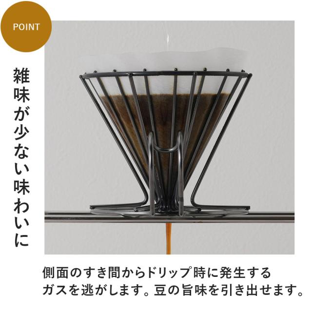 の剥がれなどは発生しにくいです。2〜6杯用のドリッパー。ワイヤーのフレームはドリップ時に発生するガスが側面からも抜けることでお湯の通りが良くなり、雑味の抽出を抑えた香り立つ美味しいコーヒーが淹れられます。円錐型の紙フィルターはもちろん扇型紙フィルターもワイヤーに挟み込むようにセットして使用できます。 ※口部外径10cm以上のカップ・サーバーにはセットできません。