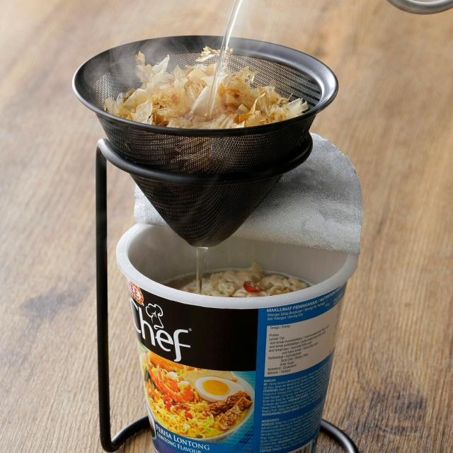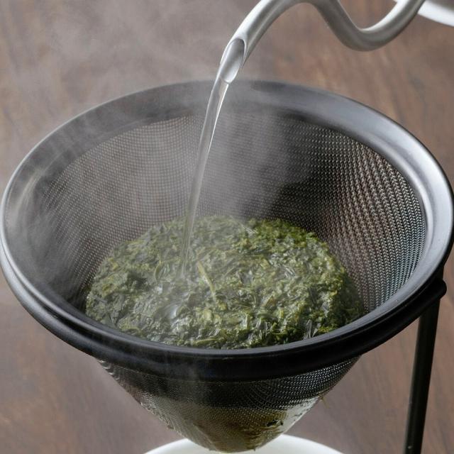 香りを楽しむ、お茶ドリップ!お茶以外ではカツオ節でだし濾しに!お茶漬けやカップラーメンのお湯代わりに!ひと味違うスープになります。フィルターを使えばコーヒーも淹れられます。スタンドをひっくり返せば高さ調整も可能。ストレーナーは丈夫な網を使用。テーブルの上、おもてなしに、その場で淹れる演出!茶葉の広がる瞬間と、立ち上る香りを楽しめます。休日に至福なホッとするひと時を。ストレーナー黒発色仕上げ!