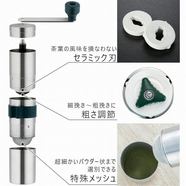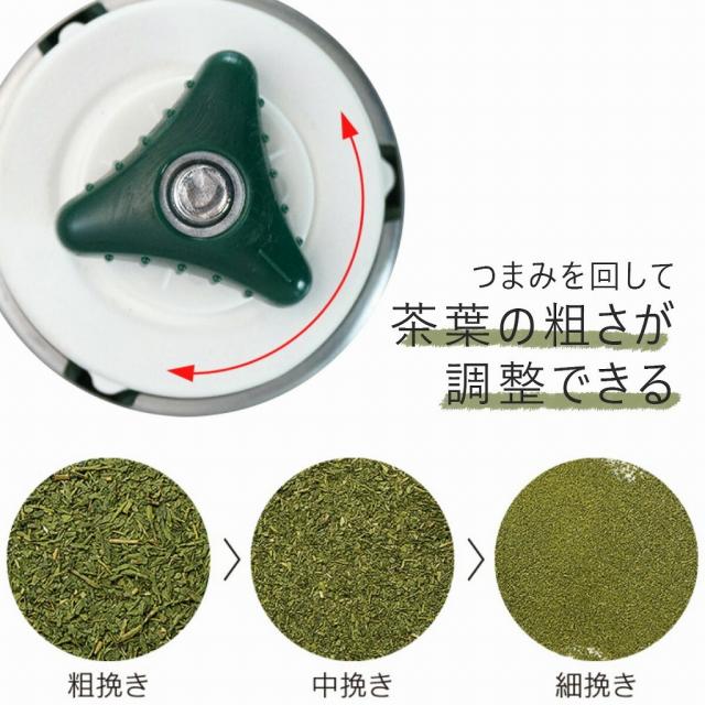 細→中→粗挽きと 微調整が可能 国産セラミック刃はうす式でバラツキなく均一な大きさで挽くことができます。セラミックは熱の発生を抑え、茶葉の風味を損ないません。また摩耗しにくい為、使い始めの挽き味が持続します。粗さ調節ネジで細挽き〜粗挽きの粉末状態を調整することができます。 取り外しすることもでき、水洗いも可能。 | ![]() |