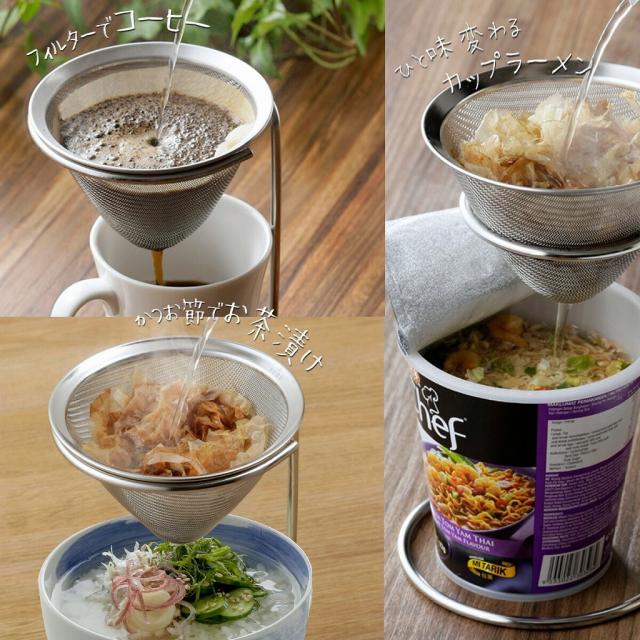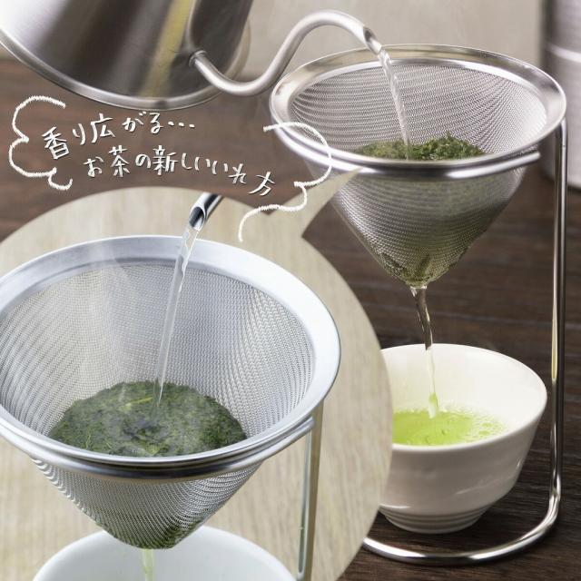 香りを楽しむ、お茶ドリップ!お茶以外ではカツオ節でだし濾しに!お茶漬けやカップラーメンのお湯代わりに!ひと味違うスープになります。フィルターを使えばコーヒーも淹れられます。スタンドをひっくり返せば高さ調整も可能。ストレーナーは丈夫な網を使用。テーブルの上、おもてなしに、その場で淹れる演出!茶葉の広がる瞬間と、立ち上る香りを楽しめます。休日に至福なホッとするひと時を。
