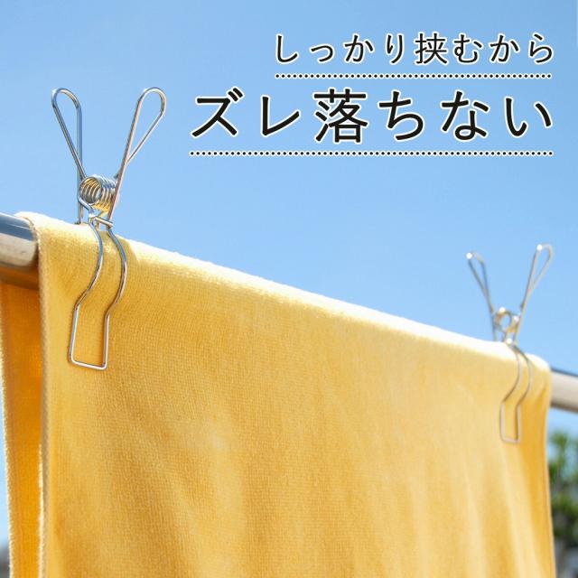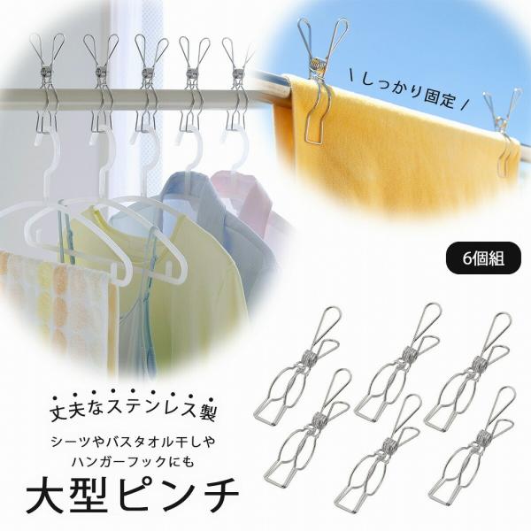 ステンレス竿ピンチ 6個組 ステンレス 物干し ピンチ シーツ バスタオル 片寄り防止 丈夫 頑丈 シーツ干し ベランダ干し ランドリー 下村企販 物干し竿用の 大型ピンチ