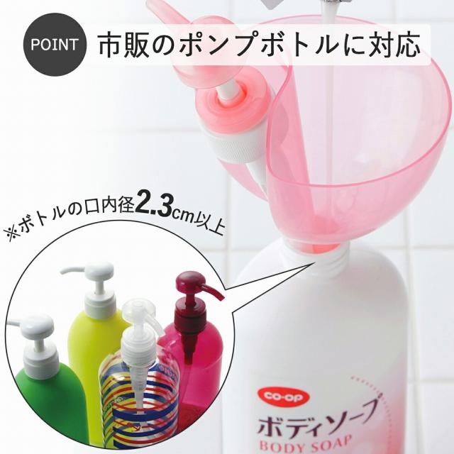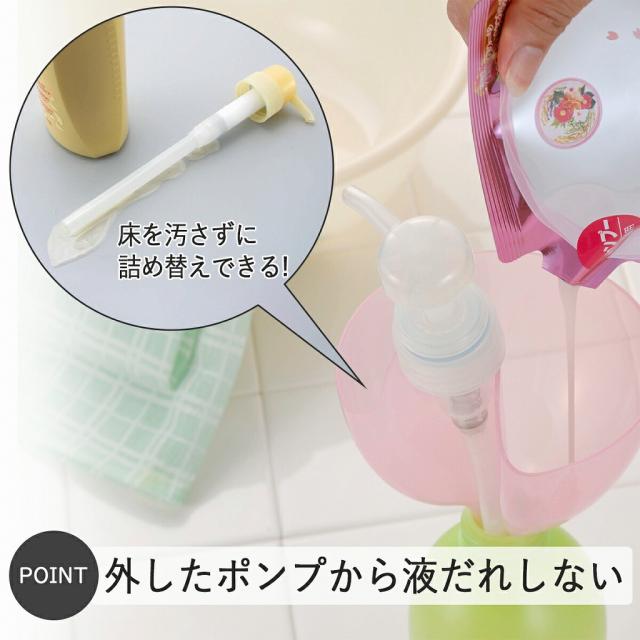 ポンプを抜かずにパックからボトルへ移し替え。注ぐ時ムダなこぼれを防ぎます。市販のポンプボトル(口内径2.3cm以上)に対応。
