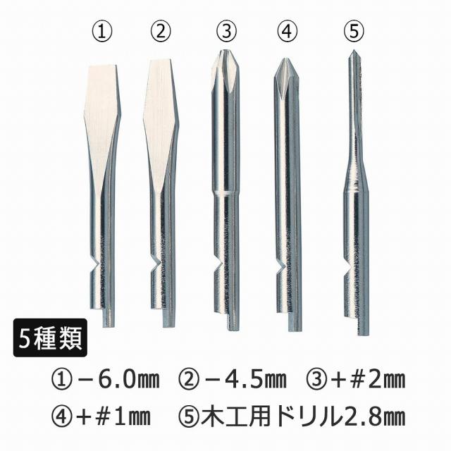 ![]() | 5種類のビット付き 1.−6mm・・・1本 2.−4.5mm・・・1本 3.+#2・・・1本 4.+#1・・・1本 5.木工用ドリル28mm・・・1本 プラスとマイナスが各2サイズ。木工用ドリルも付いてDIYにも便利なセット。ビットはハンドルの中に収納できます。 |