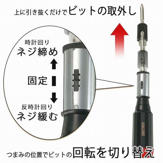 取外しも切り替えも ワンタッチ 先端の取り外しは上に引き抜くだけ。かんたんに取り換え可能です。また先端部の回転方向が選べるので、ネジを締めるのも緩めるのもできる!つまみの位置をスライドさせて切り替えます。 | ![]() |