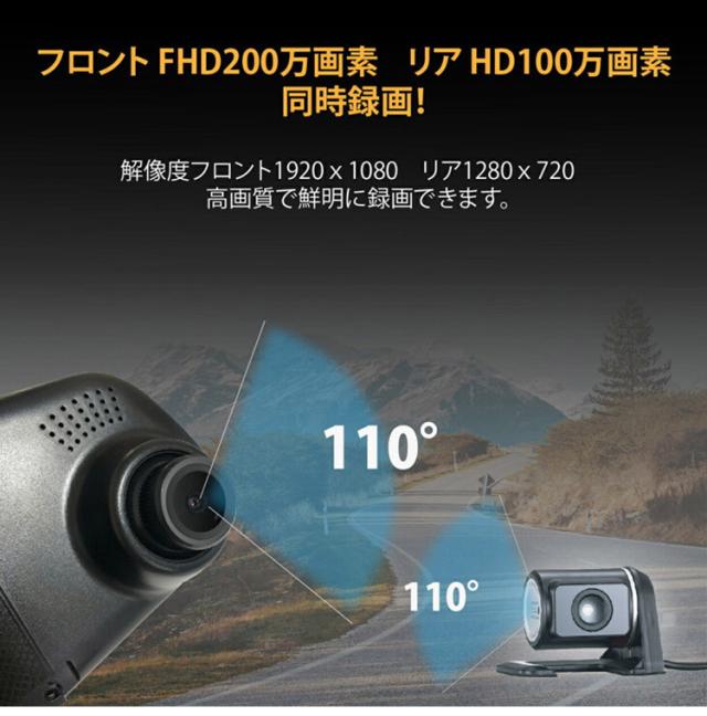 フロント200万画素、リア100万画素の高品質でクリアな撮影が可能で、車上荒らしや当て逃げなどにもしっかり対応します。