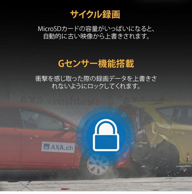 録画表示画面は4種類。衝撃を感じた際のデータを上書きされないようにロック(Gセンサー機能)
