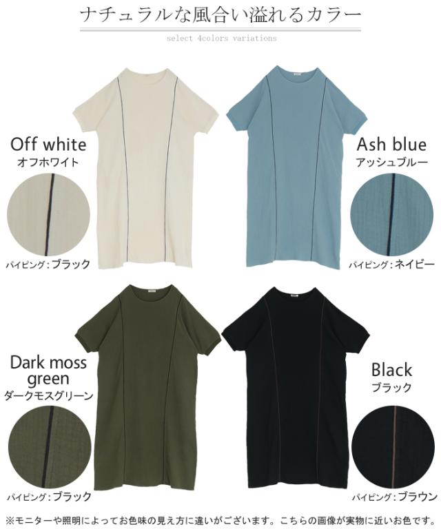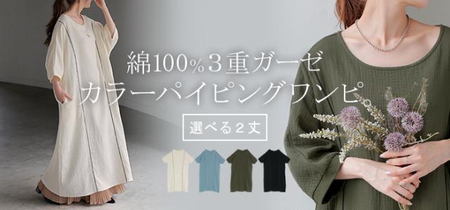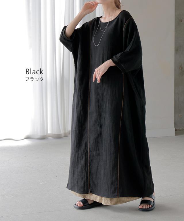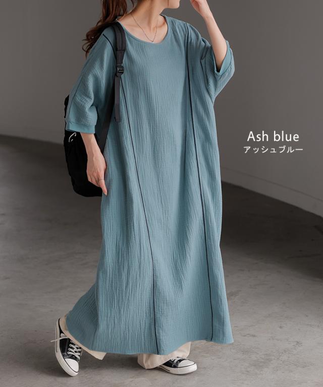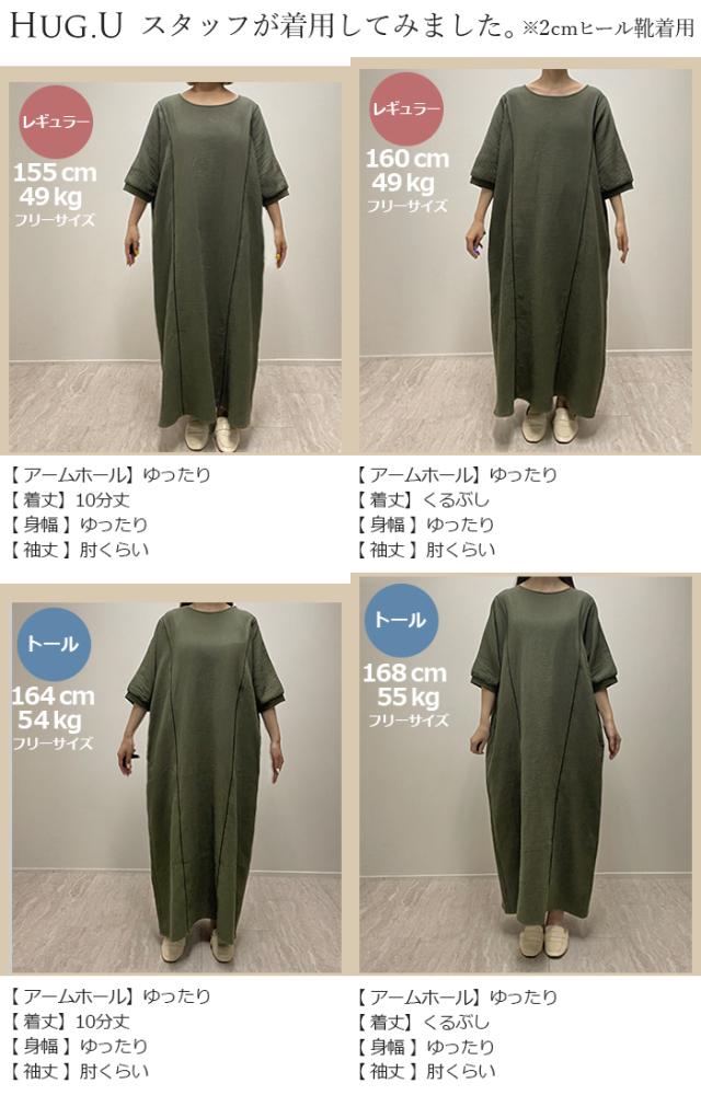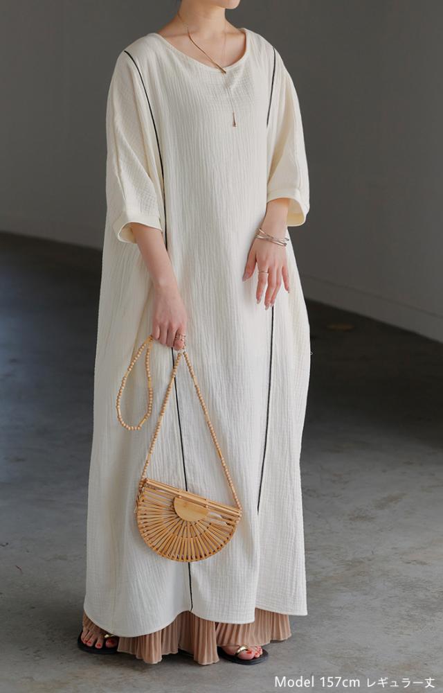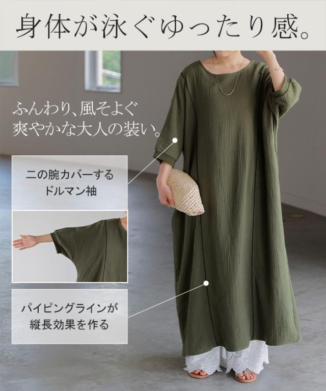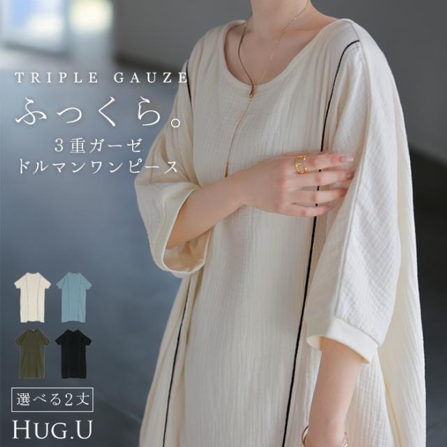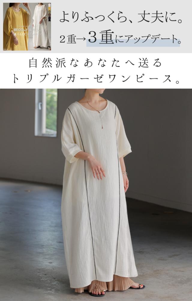 ワンピース トリプルガーゼ 綿100% レディース 一部4月中旬入荷 ワンピ 無地 Uネック コットン ロング ロングワンピース マキシ シャツワンピース フレア Aライン ノーカラー 体型カバー 大きいサイズ 半袖 ドルマン パイピング 二の腕カバー 白 黄色 春 夏 HUG.U 秋新作