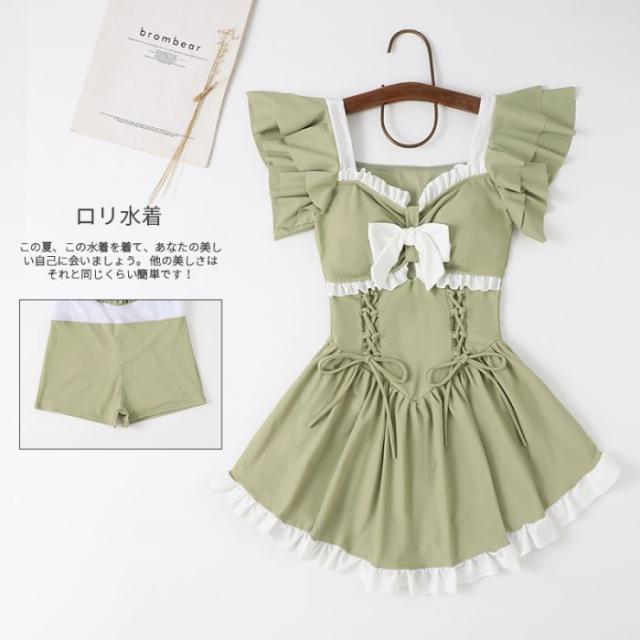 グリーンロリ少女ワンピース新品夏カバー腹甘いスカート式ボクサー学生かわいい水着