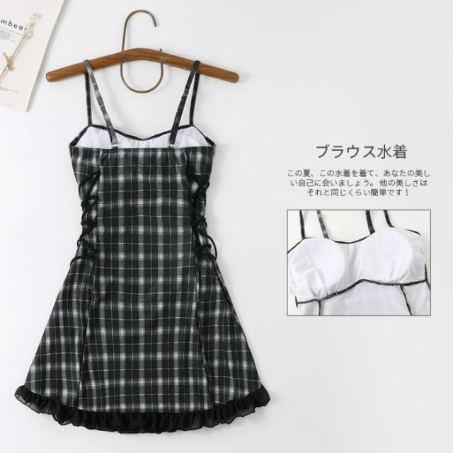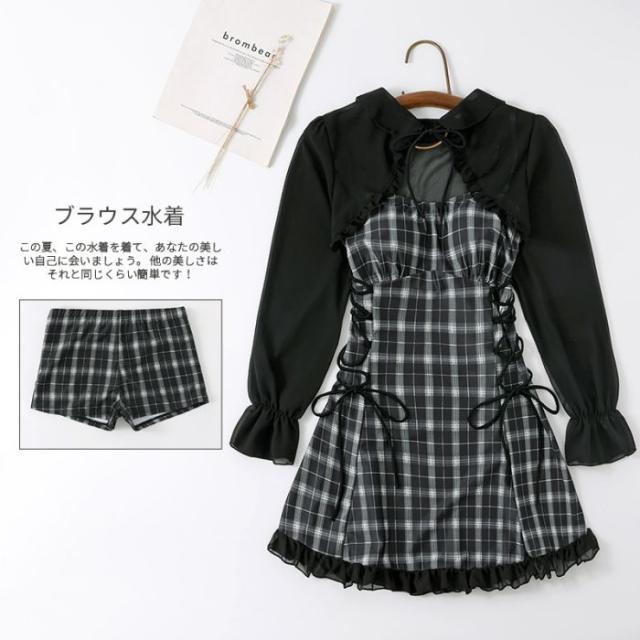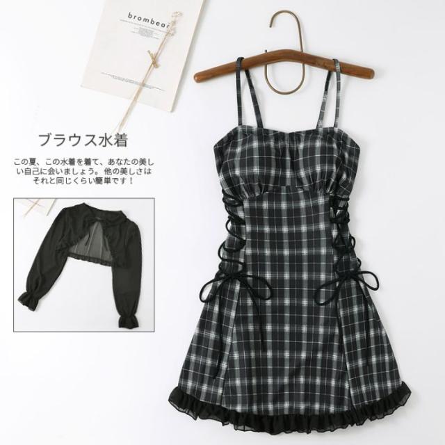 2024新品少女水着女性夏格子ins一体長袖スカート式痩せ温泉水着