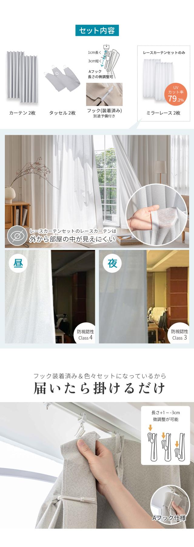 幅100cm/カーテン2枚・レース2枚(4枚セット)・タッセル・フック(カーテン装着済/予備数個)