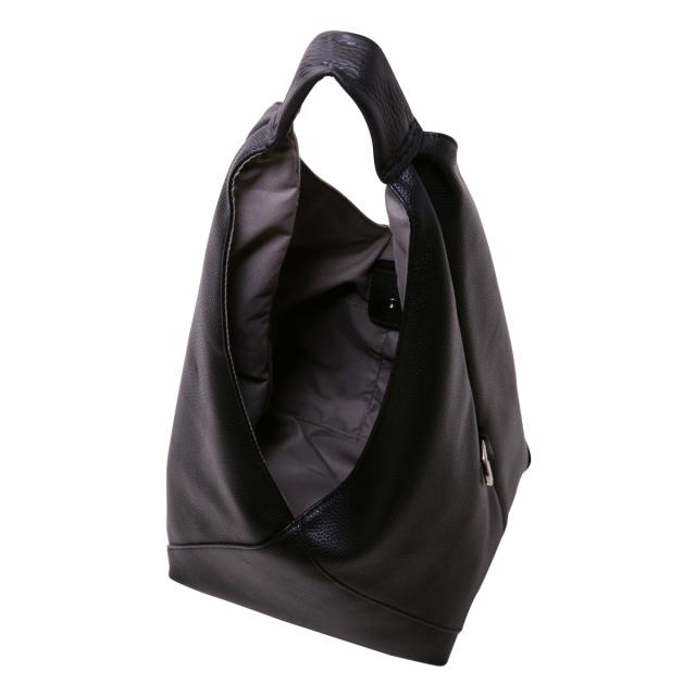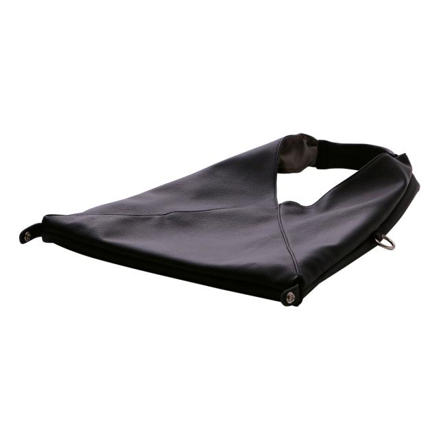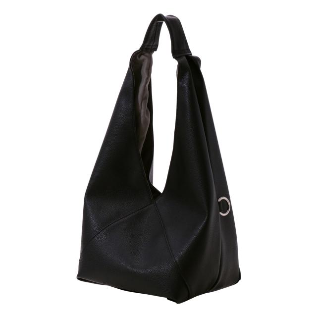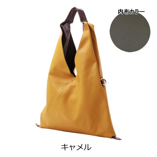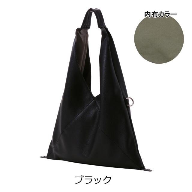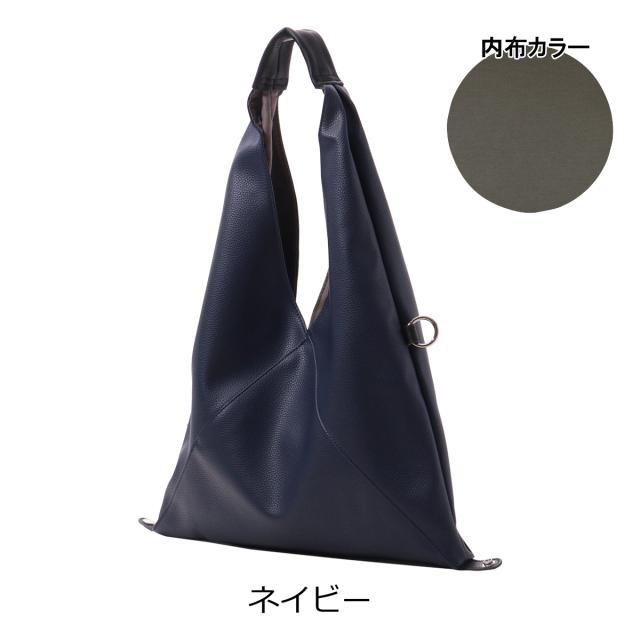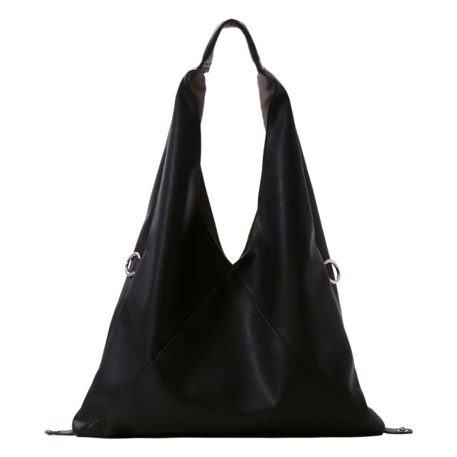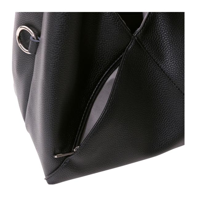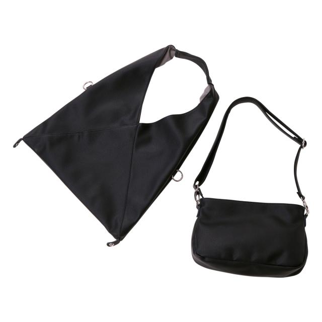 三角シルエットが印象的なビッグバッグは、なんと共素材のインナーポーチとショルダーストラップ付き! 底のホックを止めることでマチ付きバッグに。また、サイドのカンを使えば斜めがけバッグにも早変わり!組み合わせによって色々なアレンジのできる3点セット。メインバッグはA4サイズも入る大きめサイズ! 内ポケットも充実していて、見た目以上の使い勝手です。