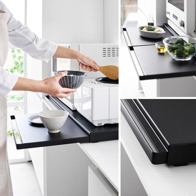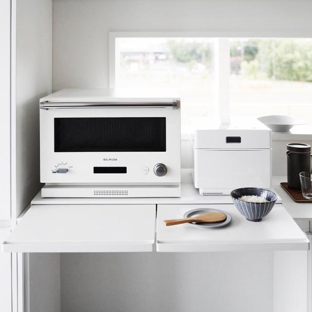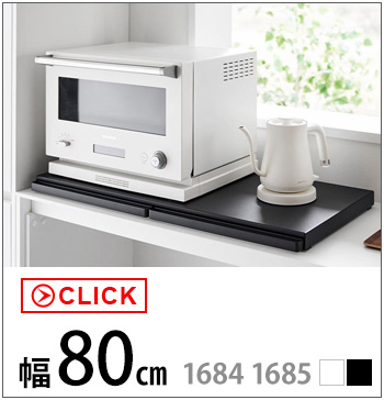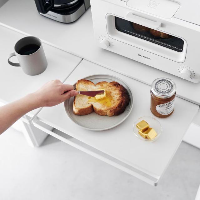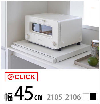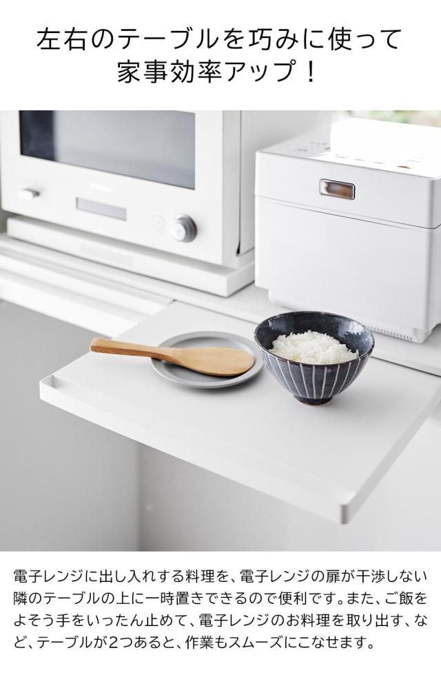 調理家電の下に設置して使う、便利なワイドサイズの置き台。サッと引き出すだけでスペースが生まれるので、ご飯をよそう際にお茶碗を置いたり、トッピングや仕上げなどの調理台として使えます。幅80cmのワイドサイズなので、天板には電子レンジと炊飯器などの大きな調理家電を並べて置けます。2つあるテーブルを上手に使えば、電子レンジやトースターの扉と干渉せず一時置きできて便利◎。使わない時は家電下に収納出来るので、キッチンの限られたスペースでも邪魔にならないスマートなテーブルです。キッチンのスペースに合わせて、幅45cmサイズ もお選びいただけます。