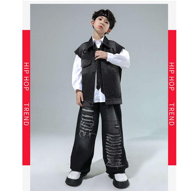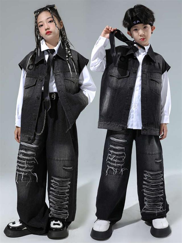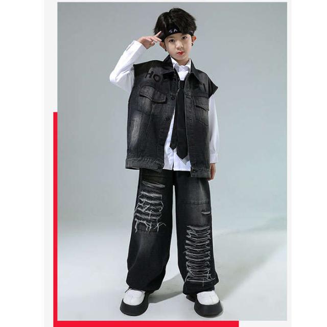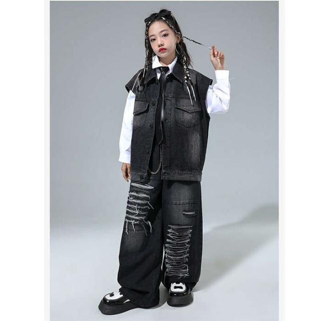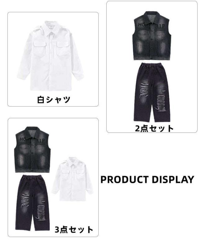 商品名:ダンス衣装 デニム ダンス服 女の子 男の子 白シャツ デニムベスト デニムパンツ ダンスウェア ヒップホップ ダンス着 hiphop jazz K-POP セットアップ かっこういい 黒 ズボン 子供服 ジーンズ デニムセット ステージ衣装 個性 発表会 イベント衣装 ステージ衣装 モダンダンス 踊り ダンス大会 カジュアル 文化祭 学園祭演出服 人気 おしゃれ