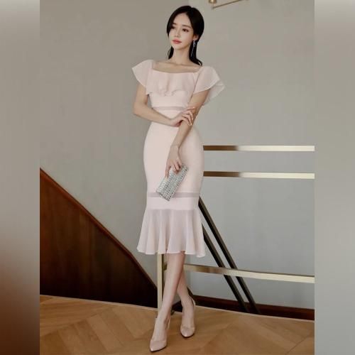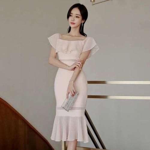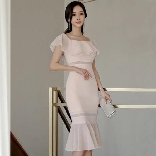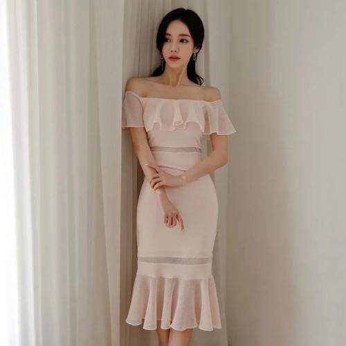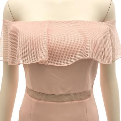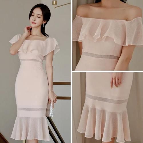 オフショルと裾のメッシュフリルが華やかでフェミニンなマーメイドワンピ。