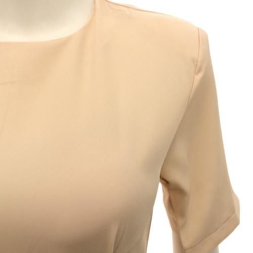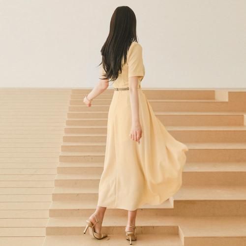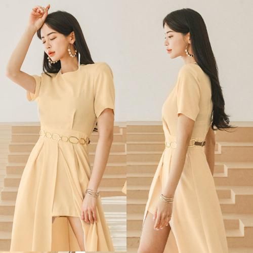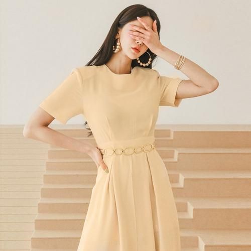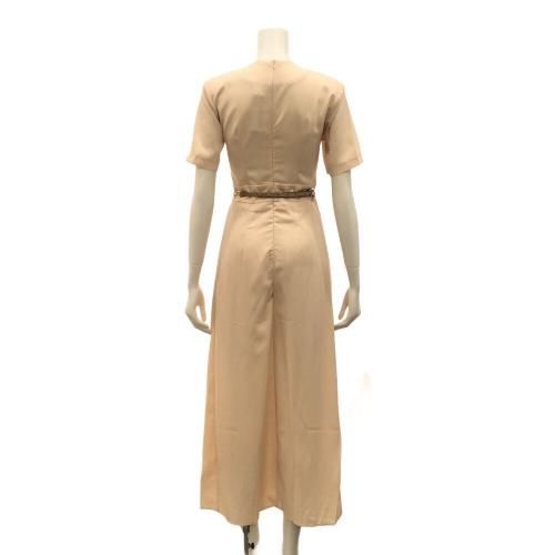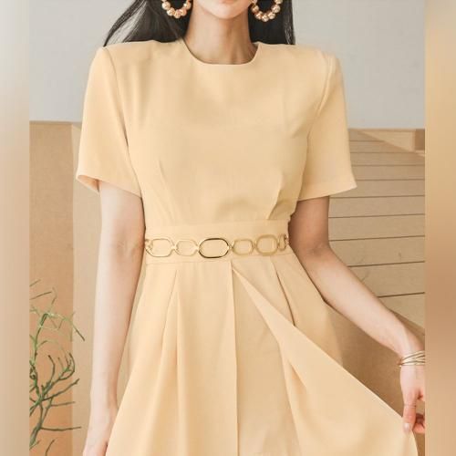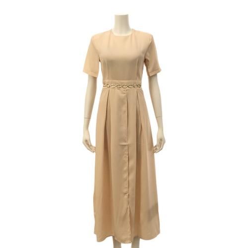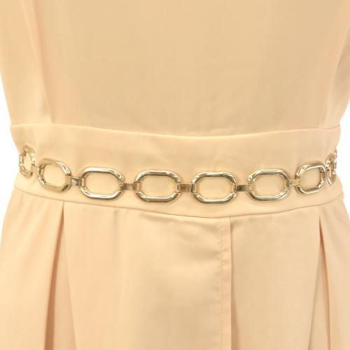ベージュに近いオレンジカラーワンピにゴールドチェーンデザインのブラウンベルトが全体をグッと引き締めて大人な雰囲気に。