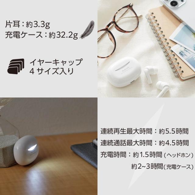 ■商品名:ELECOM ワイヤレスイヤホン Bluetooth 5.2 アクティブ ノイズキャンセリング 耳せん機能 低遅延モード 外音モード タッチセンサー 超軽量 ホワイト