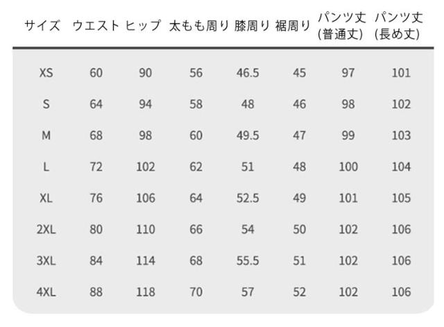 | サイズについての説明 | 【XS】:お勧め体重37.5-42kg 【S】:お勧め体重42.5-49kg 【M】:お勧め体重49-54kg 【L】:お勧め体重54.5-59kg 【XL】:お勧め体重59.5-64kg 【2XL】:お勧め体重64.5-72.5kg 【3XL】:お勧め体重73-80kg 【4XL】:お勧め体重80-90kg /普通丈:目安身長165CM以下 /長め丈:目安身長167CM以上 ※上記サイズは平置き実寸になります。 サイズ表の実寸法は商品によって1-3cm程度の誤差がある場合がございます。(単位:cm) |