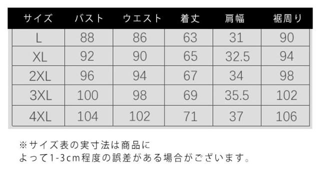 | サイズについての説明 | サイズ バスト ウエスト 着丈 肩幅 裾周り ※サイズ表の実寸法は商品によって1-3cm程度の誤差がある場合がございます。 |