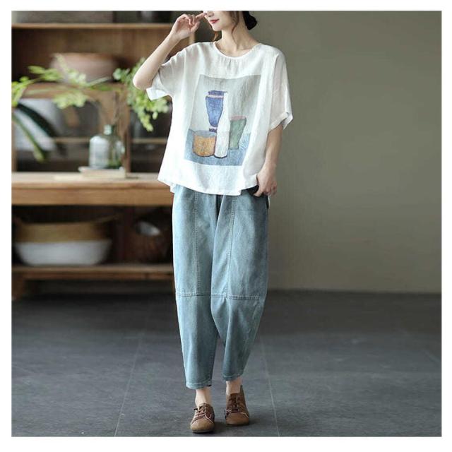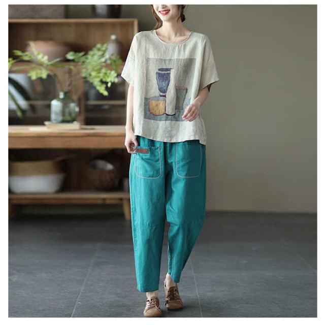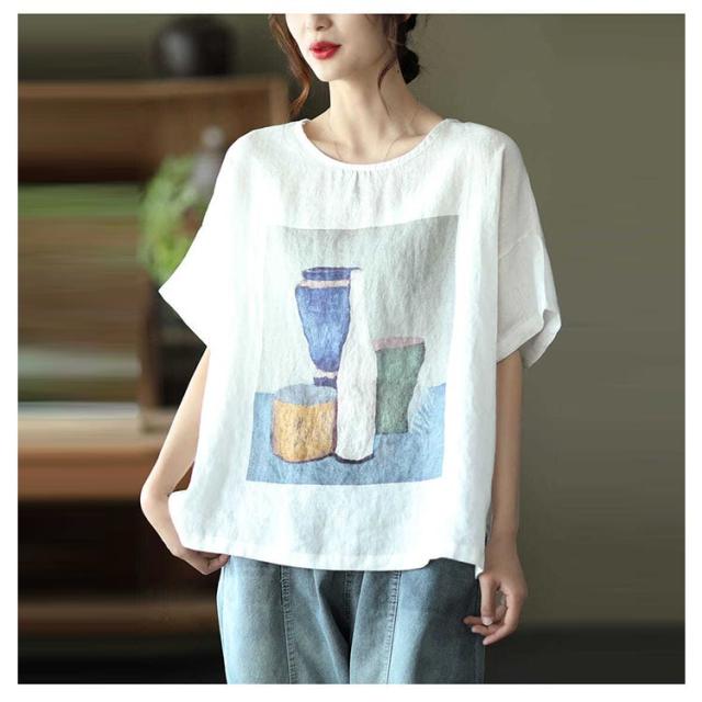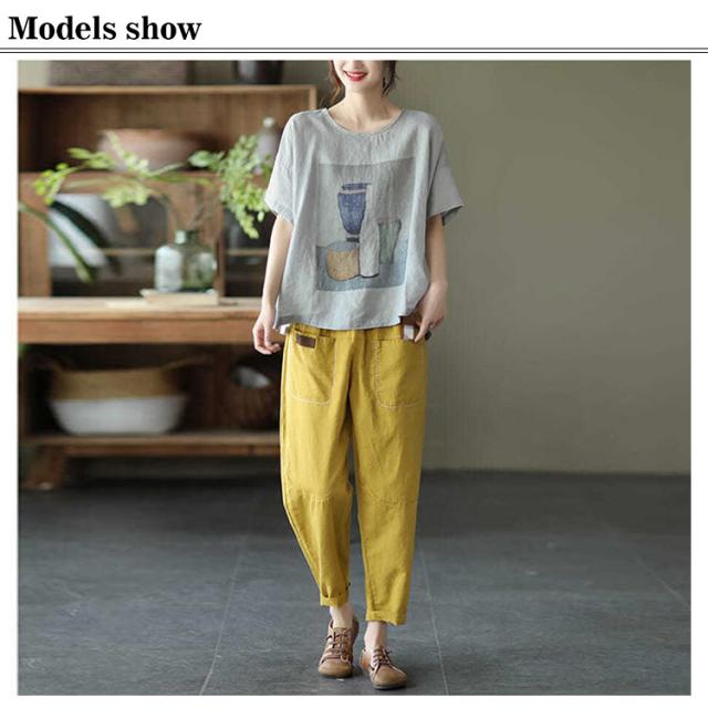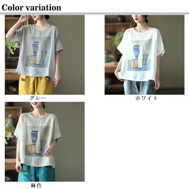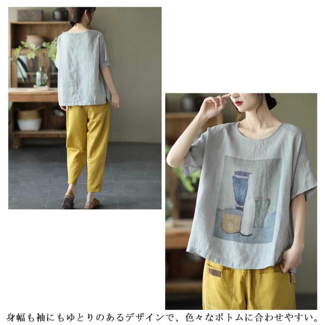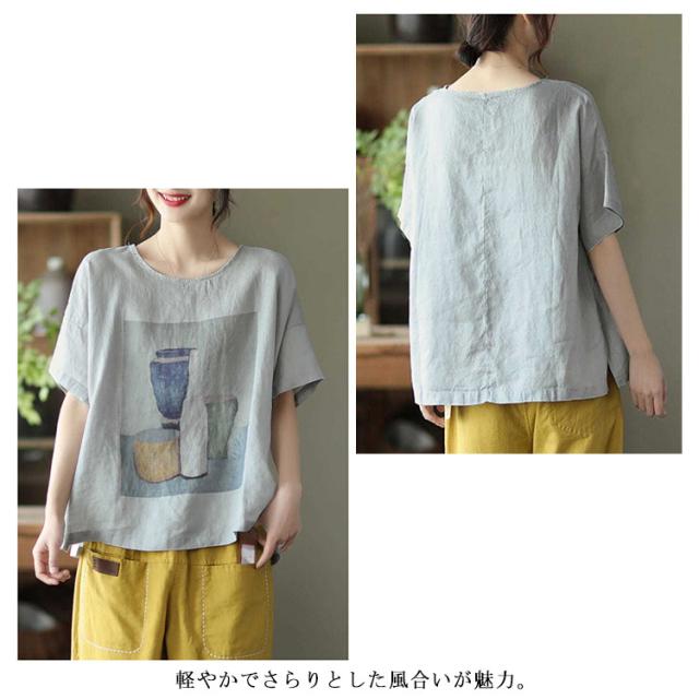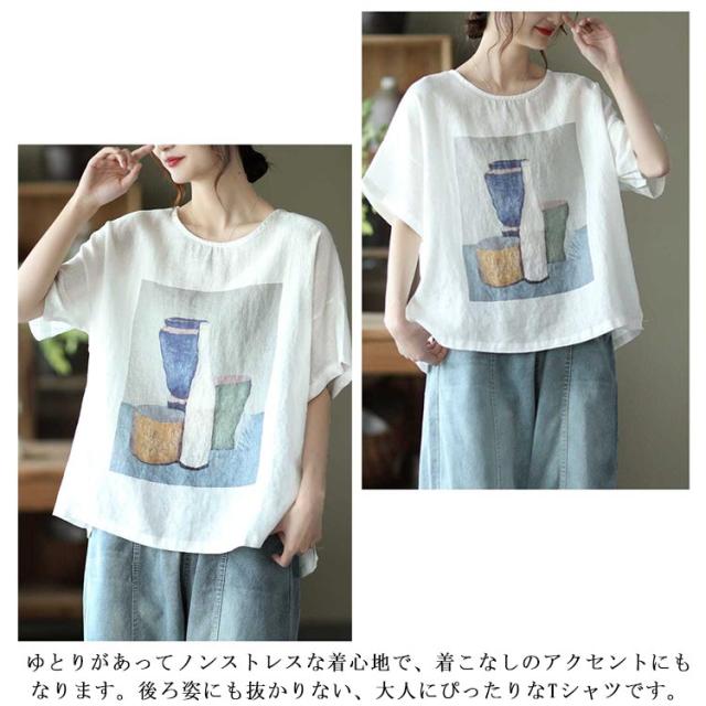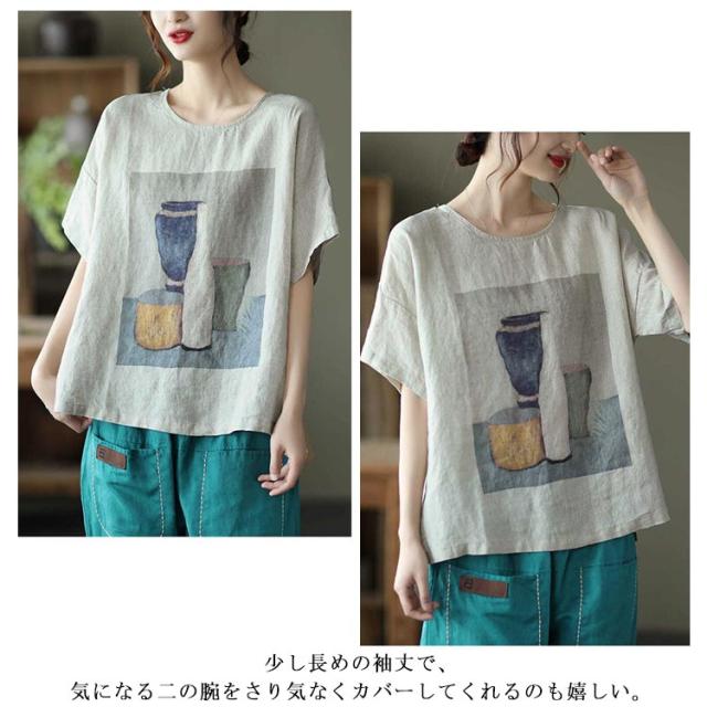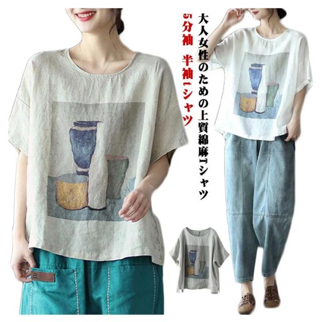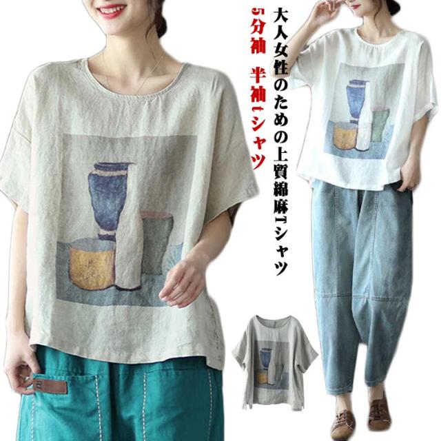 夏服 リネンtシャツ ナチュラル 半袖tシャツ プリントtシャツ 綿麻tシャツ 綿麻 クルーネック 半袖 綿麻tシャツ tシャツ 半袖tシャツ 薄手 5分袖 プリント 大人 女性 大きサイズ シンプル 夏物 トップス 涼しい 大きいサイズ 着?せ 体型カバー ギフト プレゼント