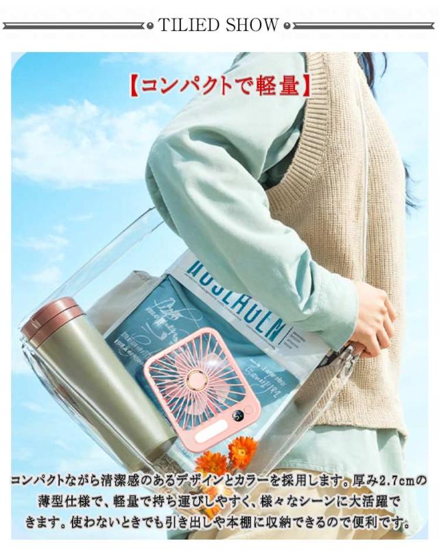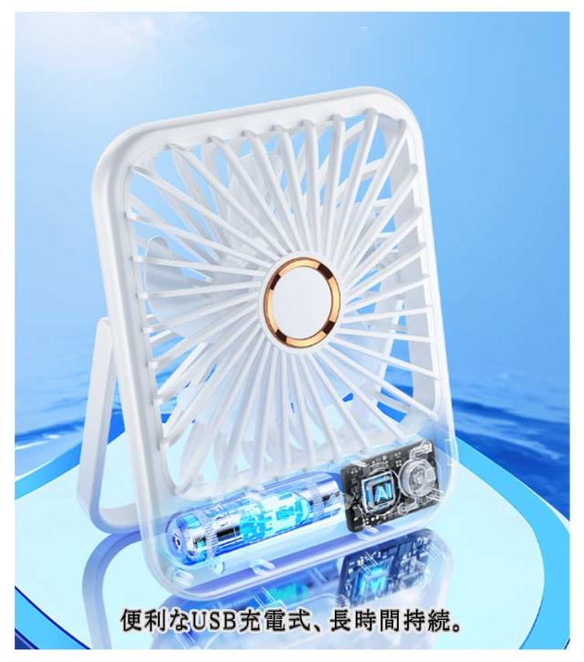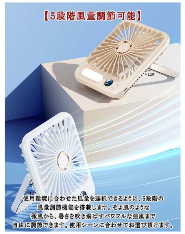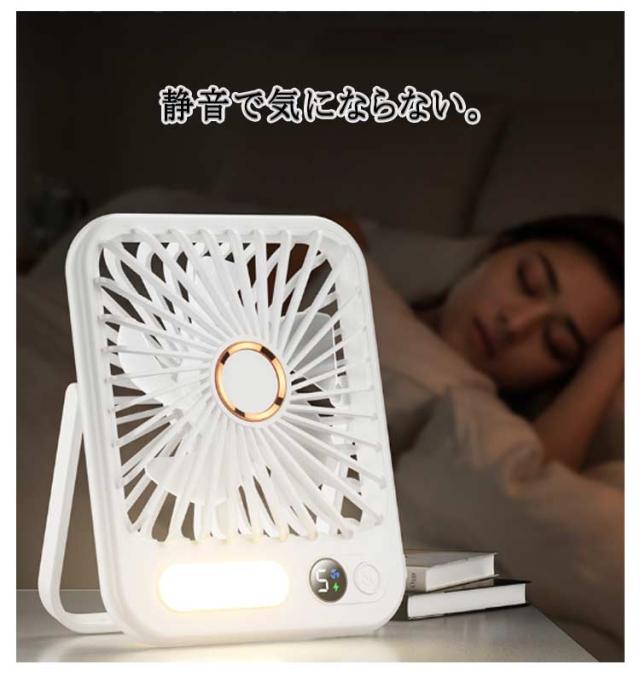 | 【コンパクトで軽量】 コンパクトながら清潔感のあるデザインとカラーを採用します。厚み2.7cmの薄型仕様で、軽量で持ち運びしやすく、様々なシーンに大活躍できます。使わないときでも引き出しや本棚に収納できるので便利です。 【 led付き】 寝室の常夜灯としても使えます。 【5段階風量調節可能】 使用環境に合わせた風量を選択できるように、5段階の風量調節機能を搭載します。そよ風のような微風から、暑さを吹き飛ばすパワフルな強風まで自由に調節できます。使用シーンに合わせてお選び頂けます。 1、 【その他の特徴】 2、 卓上でも手持ちでも両方とも使用できる。 3、上下の角度は手動で180度調節可能。 3、操作は切り替えボタンのみ、LED数字で風量の設定とバッテリー残量が確認できる。 4、静音で気にならない。 5、便利なUSB充電式、長時間持続。 6、安全設計、指を挟まない。 | |