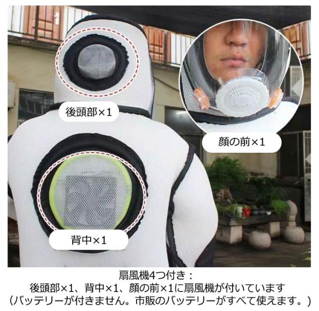 | 通気性が高い扇風機3つ付き、3Dメッシュ構造のスズメバチ駆除用蜂防護服。【手袋、長靴付き】 扇風機4つ付き:後頭部×1、背中×1、顔の前×1に扇風機が付いています(バッテリーが付きません。市販のバッテリーがすべて使えます。) 着心地の良い、柔らかくて通気性抜群ナイロンを採用します。 約2cm肥厚した布は、ハチの咬傷からよりよく保護することができる。 3Dメッシュ構造で軽くて蒸れにくい作りで、超軽量で着心地が良く、自由自在に作業できます。 通気性のあるナイロン素材で扇風機が付属しているため、通気性が高く放熱性に優れています。 | |