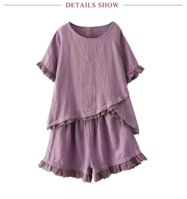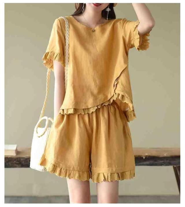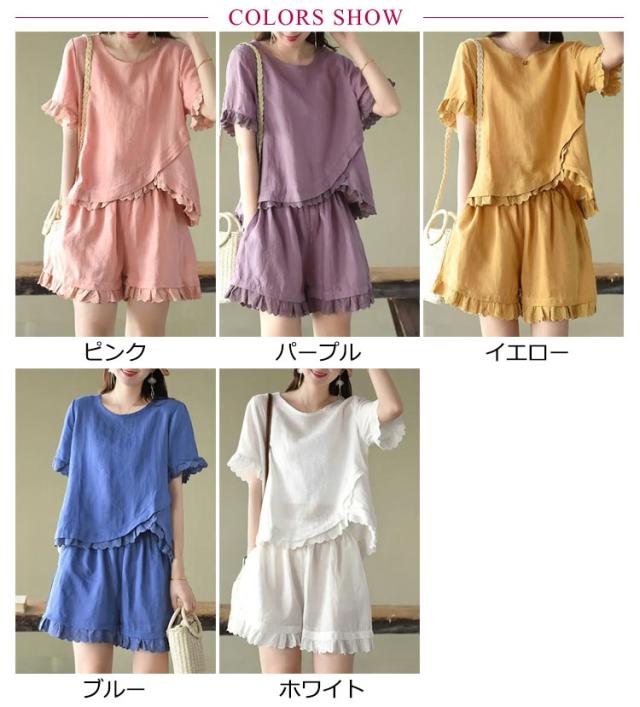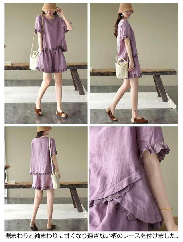 リネン ナチュラル レディース ショートパンツ 半袖 シャツ ブラウス 半袖 短パン レース フリル 可愛い トップス tシャツ 綿麻 2点セット ハーフパンツ イージーパンツ 上下セット 夏 ゆったり 無地 シンプル ルームウェア 部屋着 大きいサイズ