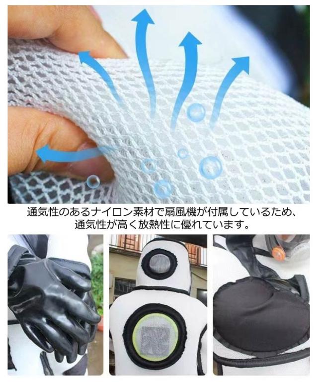 | 通気性が高い扇風機3つ付き、3Dメッシュ構造のスズメバチ駆除用蜂防護服。【手袋、長靴付き】 扇風機4つ付き:後頭部×1、背中×1、顔の前×1に扇風機が付いています(バッテリーが付きません。市販のバッテリーがすべて使えます。) 着心地の良い、柔らかくて通気性抜群ナイロンを採用します。 約2cm肥厚した布は、ハチの咬傷からよりよく保護することができる。 3Dメッシュ構造で軽くて蒸れにくい作りで、超軽量で着心地が良く、自由自在に作業できます。 通気性のあるナイロン素材で扇風機が付属しているため、通気性が高く放熱性に優れています。 | |