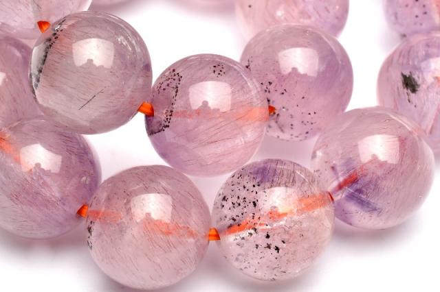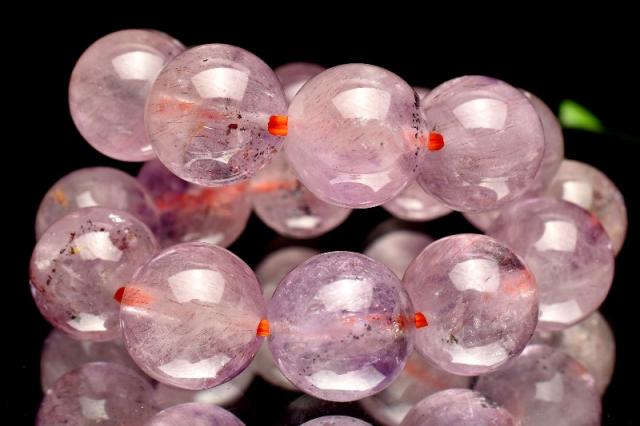 | 特徴・意味 | 細い繊維状のゲーサイトやレピドクロサイトが濃密に内包されたピンク色の可愛らしいスーパーセブンです。 非常に高品質なので水晶の透明度も高く、内包物をじっくり観察することができます。 アメジストのパープルも随所に入り、春の花々のような華やかさがあります。 ここまで統一のサイズとカラーで作られるブレスレットは稀です。 華やかなカラーでとてもオススメです。 パワーストーンの定番アメジストに、細かなゲーサイトやレピドクロサイトが入っているアメジストスーパーセブンです。 スーパーセブンとは、水晶にアメジスト・スモーキークォーツ・カコクセナイト・ルチルクオーツ・ゲーサイト・レピドクロサイトなどが内包された鉱物の通称名です。 肉眼で7種類の鉱物を全て確認できる事は非常にまれですが、7つの鉱物が内包された状態の原石をカットし、加工した石もスーパーセブンと呼ばれます。 |
