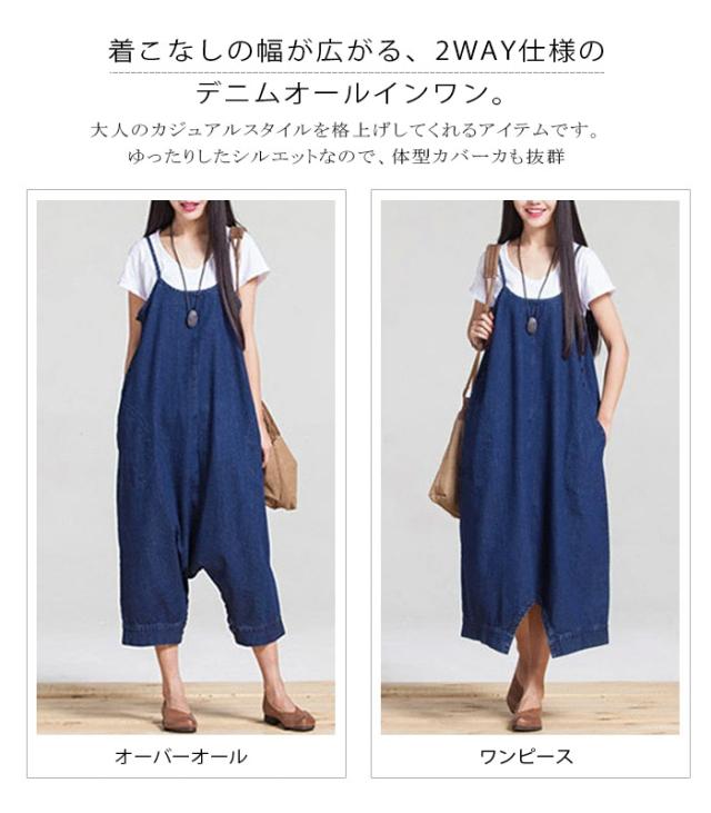 サロペット デニム パンツ レディース オールインワン ゆったり マキシワンピース つなぎ オーバーオール 体型カバー