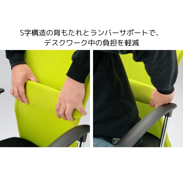 S字構造の背もたれと調整可能なランバーサポートで、デスクワーク中の負担を軽減。