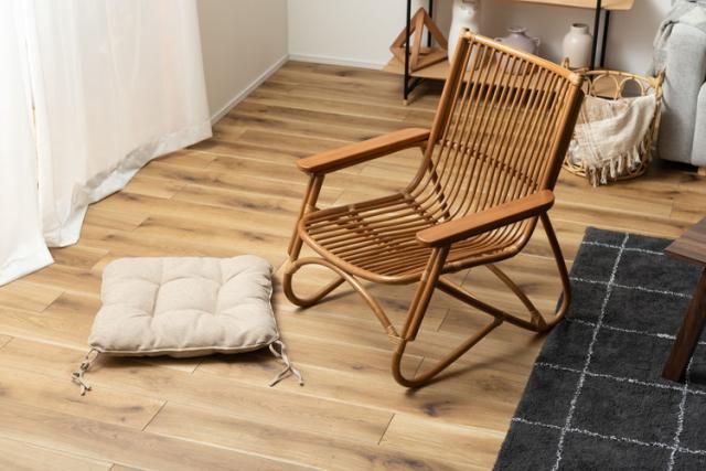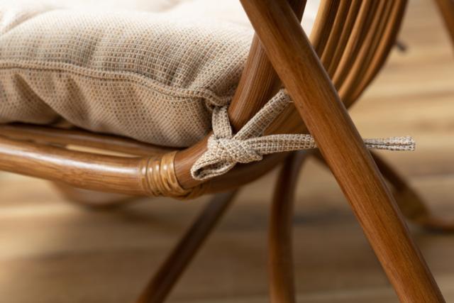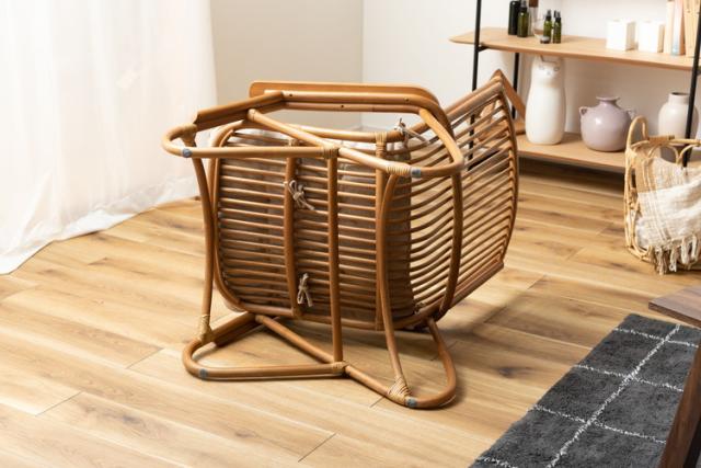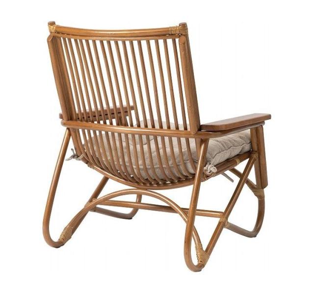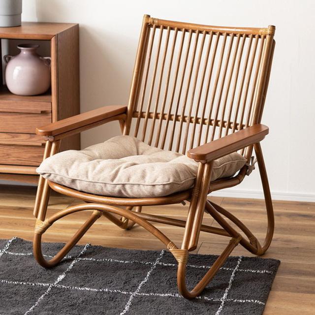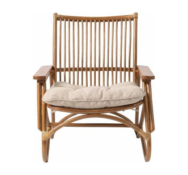 ●脚のカーブが美しい、天然木×ラタンのパーソナルチェア。●ゆったりと座りやすい形状と、印象的なデザインが特徴です。●肘掛けには天然木(チーク)を使用。天然木のぬくもりがしっかりと手に馴染みます。●ラタン(籐)ならではの、しなやかで柔らかい曲線も魅力の一つです。●背もたれには緩いカーブを掛けているので、ゆったりとくつろぐことができます。●ほどよいクッション性のある座面クッションは取り外しが可能です。