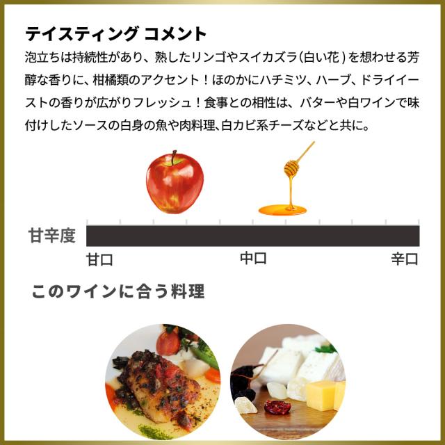 ![]() ■ぶどう品種:ピノ・ブラン種100% ■発酵・熟成:瓶内2次発酵 サクラワインアワード2023度金賞・ゴールドメダル受賞酒!美しく輝く淡い黄色!泡立ちは持続性があり、熟したリンゴやスイカズラ(白い花)を想わせる芳醇な香りに、柑橘類のアクセント! ほのかにハチミツ、ハーブ、ドライイーストの香りが広がりフレッシュ!口当たりは柔らかくクリーミー!リッチな果実味に、まろやかな酸味が溶け込み、余韻に続く苦味が心地よい! 果実のフレッシュ感とデリケートさを堪能出来るドライなスパークリングワインです! 食事との相性は、バターや白ワインで味付けしたソースの白身の魚や肉料理、白カビ系チーズなどと共に。 |