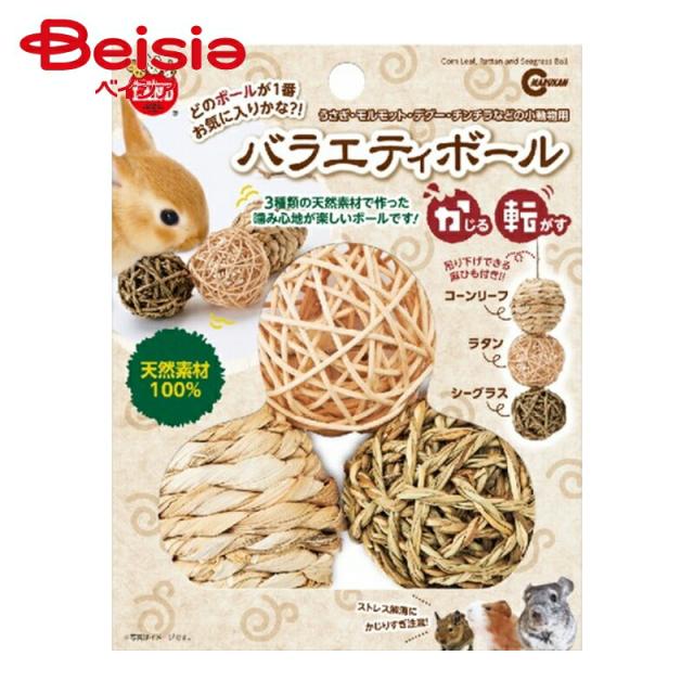 | 商品特徴 | コーンリーフ・ラタン・シーウィードの3種類の素材のボールを連結した、色々な齧り心地が楽しめるおもちゃです。天然素材100% |