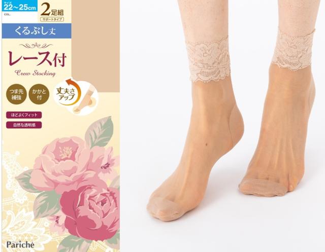 2足組のくるぶし丈ストッキングは、上品なレース付きデザインで足元を華やかに演出します。