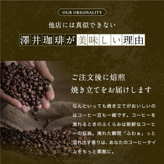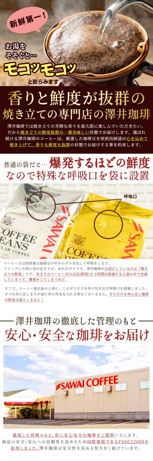 澤井珈琲(さわいこーひー)では、お客様のお家に商品が届き、箱を開けた瞬間。そして、トレードマークの赤いコーヒー袋の封を開けた時に鮮度抜群の「香り高さ」と、飲んだときの「味わい」に感動して頂けるように、レギュラーコーヒーはご注文を頂いてから焙煎をして焼きたてのコーヒー、コーヒー豆、珈琲、珈琲豆をお届けをしている焼き立て珈琲専門店です。お客様に「美味しい」と言って喜んで頂く事が私たちの喜びと思ってます。「美味しいコーヒーをお届けしたい」と想い続けて生まれたこだわりの味を、どうぞ、この機会にお楽しみくださいませ。澤井珈琲では、コーヒー豆は挽き方がご選択いただけます。珈琲豆を挽く事をお楽しみ頂ける『豆のまま』や、私共の専用の特注サイズの大型のミルで挽いて、コーヒー粉の状態にしてお届けする方法がございます。中挽き、細挽き、粗挽き、荒挽きなど様々な挽き方がございますが、私共がお薦めする『店長のおすすめ挽き』にて、そのコーヒーに合った一番美味しいと思える挽き方に挽いてお届けします。東京の銀座にも実店舗を構え、都内では浅草やスカイツリーのあるソラマチにも出店。「鳥取のコーヒー屋さん」とも呼ばれてますが、空気が綺麗で自然豊かな鳥取県に焙煎工場を構え、隣接する島根県の松江市や出雲市にも実店舗がございます。顔の見えないネット通販ですが、全国11店舗を展開する安心安全な澤井珈琲は、特徴的な「赤いコーヒー袋」に入れて、全国の珈琲好きにお選び頂いてます。よく間違えられる名前として、沢井珈琲、沢井コーヒー、澤井珈琲店、澤井珈琲本店、さわいこーひー、サワイコーヒーなどがございますが、正式名称は澤井珈琲となります。