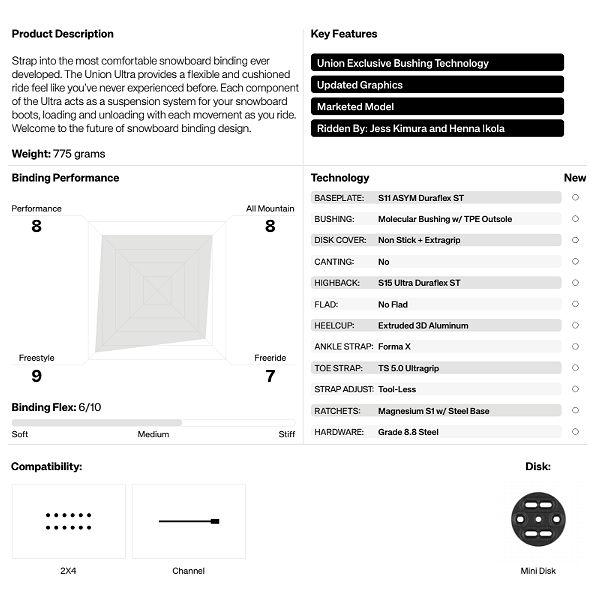 | | これまでに開発された中で最も快適なスノーボード バインディングを装着してください。Union Ultraは、これまでに経験したことのないような柔軟でクッション性のある乗り心地を提供します。Ultraの各コンポーネントは、スノーボードブーツのサスペンション システムとして機能し、乗車中の動きに合わせて荷重をかけたり下ろしたりします。スノーボードバインディングデザインの未来へようこそ。 |