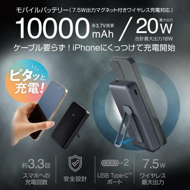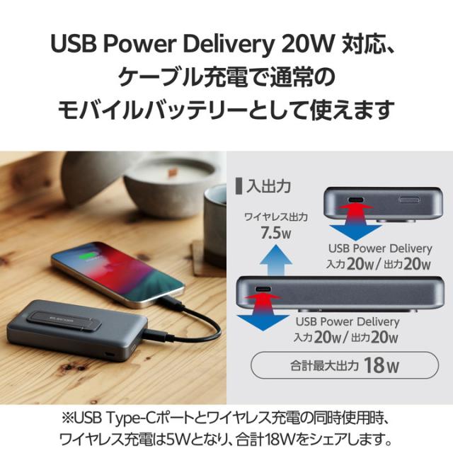 エレコム モバイルバッテリー ワイヤレス 10000mAh 大容量 20W スタンド付き リチウムイオン電池 ワイヤレス 充電器 マグネット対応 スタント付き 20W USB-C入出力×2 ブラック┃DE-C54-10000BK