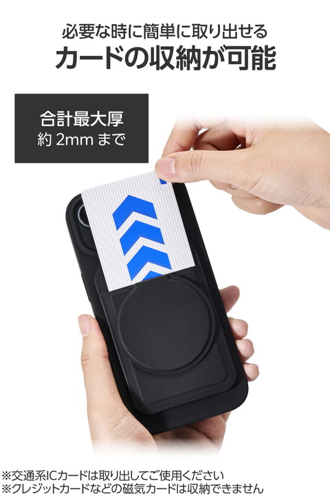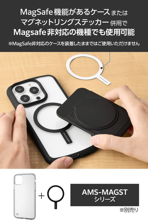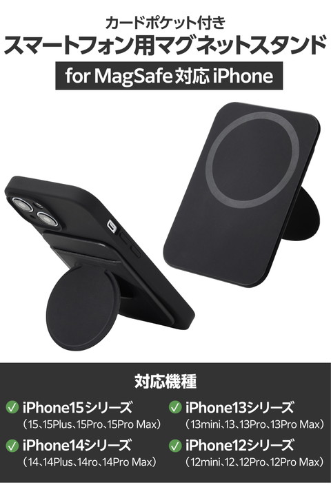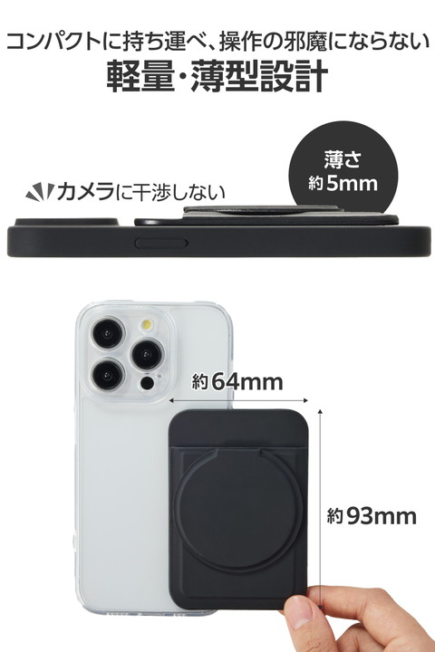 軽量・薄型でコンパクトに持ち運べる!MagSafeで簡単に着脱できる、カードポケット付きのスマートフォン用マグネットスタンドです。スマートフォンを浮かせて置けるフローティングと、縦と横の3Wayの置き方で、さまざまなシーンでも快適に動画視聴ができます。![]() ■MagSafeで簡単に着脱できる、カードポケット付きのスマートフォン用マグネットスタンドです。 ■MagSafe機能があるスマホケースやマグネットリングステッカーと併用することで、MagSafe非対応のスマートフォンでも使用可能です。 ■スマートフォンを浮かせて置けるフローティングと、縦と横の3Wayの置き方で、さまざまなシーンでも快適に動画視聴ができます。 ■軽量・薄型設計でコンパクトに持ち運べ、スマートフォンに取り付けたまま操作するときも邪魔になりにくいです。 ■スリムなデザインでありながら、免許証や交通系ICカードなどを収納可能。必要なときにサッと取り出せます。 ※合計最大厚約2mmまで ■※交通系ICカードは取り出してご使用ください。 ■※クレジットカードなどの磁気カードは収納できません。 ■指紋が付きにくく、肌触りが良いなめらかな素材を採用しています。 ■自社環境認定基準を1つ以上満たし、『THINK ECOLOGY』マークを表示した製品です。 ■環境保全に取り組み、製品の包装容器が紙・ダンボール・ポリ袋のみで構成されている製品です。 ![]() ■対応機種:iPhone 15、iPhone 15 Plus、iPhone 15 Pro、iPhone 15 Pro Max、iPhone 14、iPhone 14 Plus、iPhone 14 Pro、iPhone 14 Pro Max、iPhone 13 mini、iPhone 13、iPhone 13 Pro、iPhone 13 Pro Max、iPhone 12 mini、iPhone 12、iPhone 12 Pro、iPhone 12 Pro Max ■セット内容:カードポケット付きスマートフォン用マグネットスタンド×1 ■材質:合成皮革、磁石 ■外形寸法:幅約64mm×厚み約5mm×高さ約93mm ■カラー:ブラック |