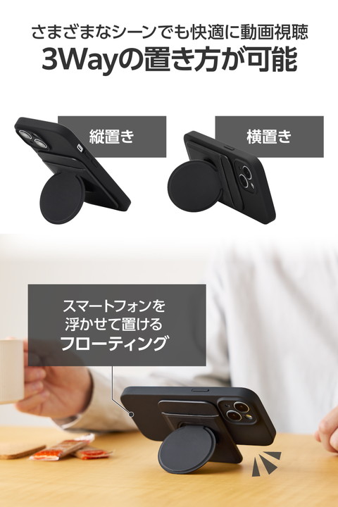 軽量・薄型でコンパクトに持ち運べる!MagSafeで簡単に着脱できる、カードポケット付きのスマートフォン用マグネットスタンドです。スマートフォンを浮かせて置けるフローティングと、縦と横の3Wayの置き方で、さまざまなシーンでも快適に動画視聴ができます。