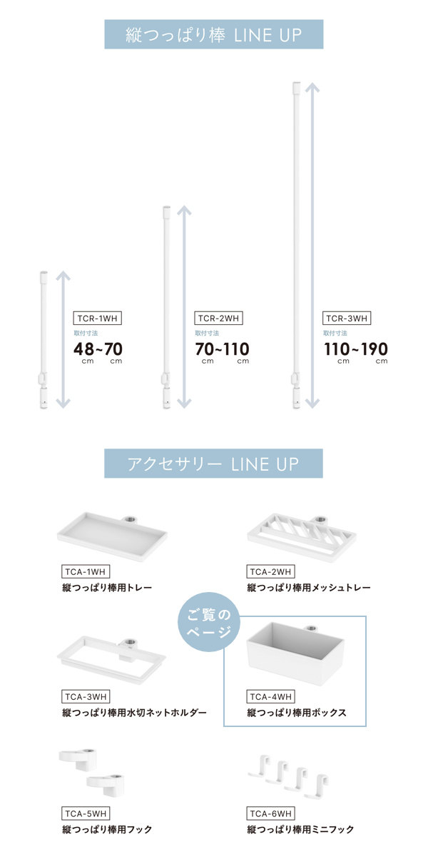 | 注意事項 | ※商品ページ内には別の商品を含む画像を使用しています ※縦つっぱり棒用ボックス(TCA-4WH)の商品ページです。対応するパーツは別売りです。 |