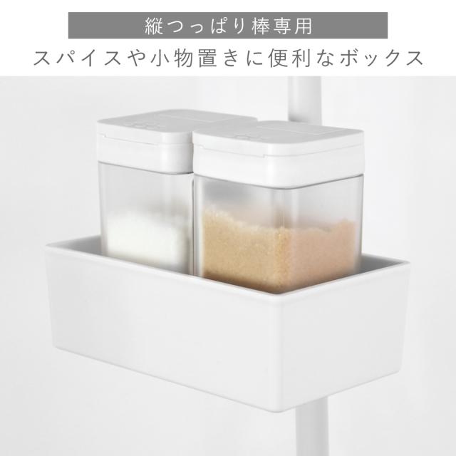別売りの縦つっぱり棒に取り付けて使えるボックスです。スパイスボトルや小物の収納にぴったりです。