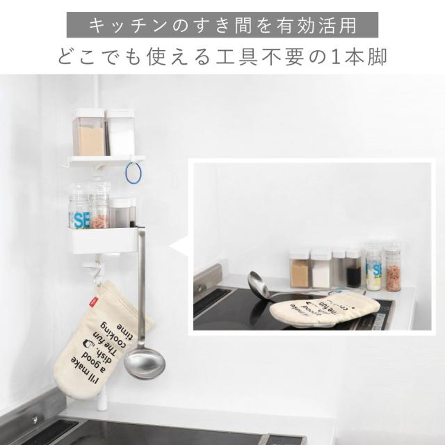 1本脚のラックは、コンロサイドのすき間にも設置できます。置き場所に困っていた調味料は、タテに収納してすっきり片付きます。浮かせて収納することで調理中に見つけやすく使いたい時にサッと手に取れます。