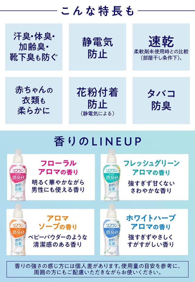 ●繊維のすみずみまで、極小消臭成分+抗菌成分が吸着。ソフランの抗菌力で、生乾きでも菌を生ませず※1、ニオわせない。汗臭・体臭・生乾き臭・加齢臭・靴下臭も0へ。