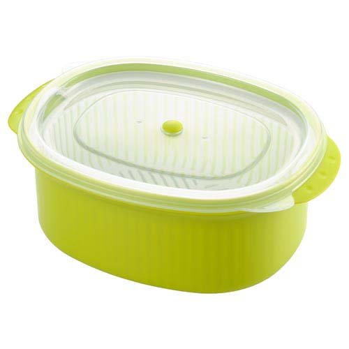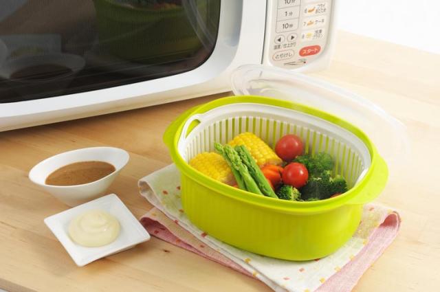 ●電子レンジで簡単に温野菜が作れる容器。ザル付きなので、洗う・水切り・アク抜きもできる